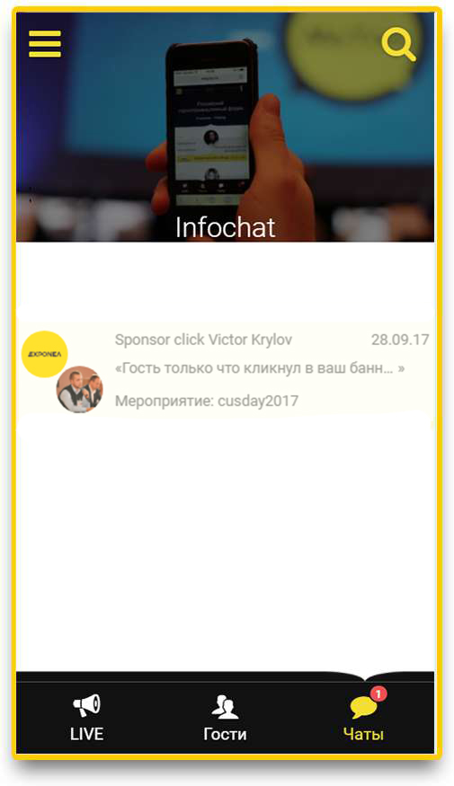 Лидогенерирующая опция. При нажатии на баннер, представитель спонсора получается уведомление и может пообщаться с гостем в личном чате